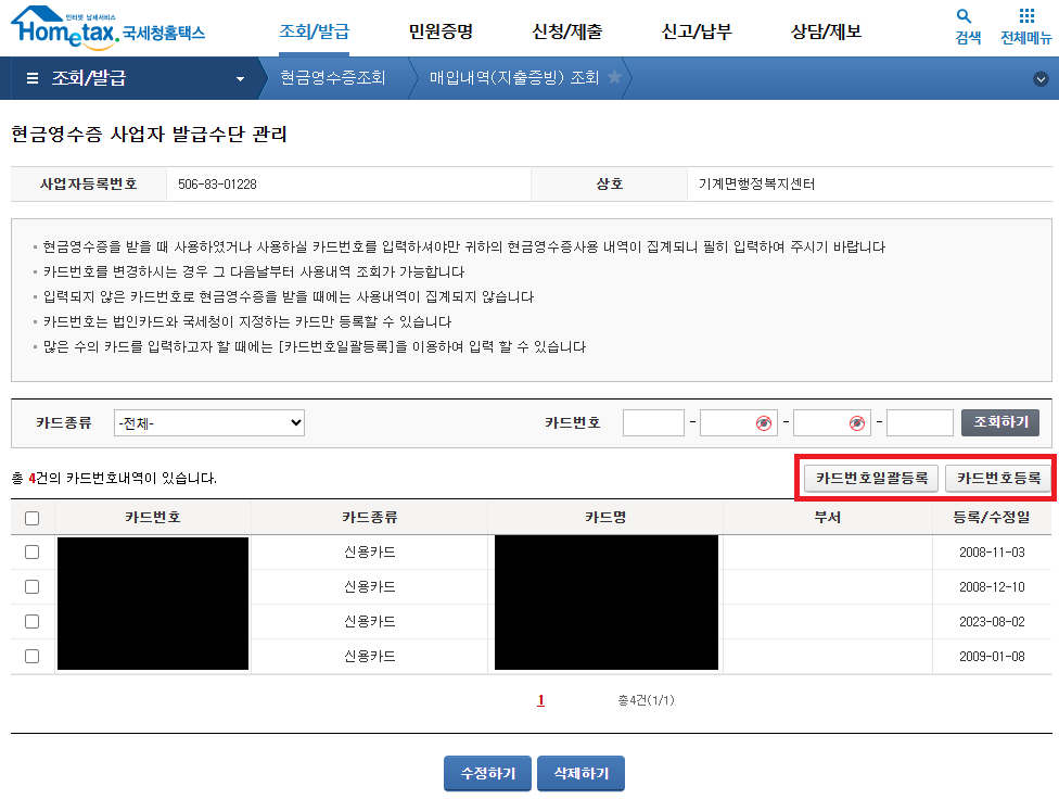 그런데 해당 메뉴는 현금영수증 발급을 위해 사용했던 카드번호를 등록해야만 내역을 확인할 수 있다. (아무것도 등록하지 않았는데 조회가 된다면 '사업자번호'로 현금영수증을 발급받은 내역이 조회되는 것이다.) 따라서 아무것도 조회가 되지 않는다면 '현금영수증 발급수단 등록/정정' 버튼을 눌러 카드를 등록해야만 한다. 해당 버튼을 눌러 보자.