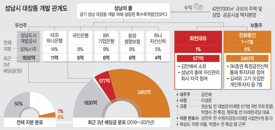- 성남의 뜰 주주협약상, 이익이 날 경우 1종·2종 우선주가 상한액이 정해진 고정배당을 가져가며 나머지는 보통주가 배당받는 구조. 따라서 화천대유와 천화통인은 7%를 투자하여 68%를 배당받는 기형적 결과가 나타남.