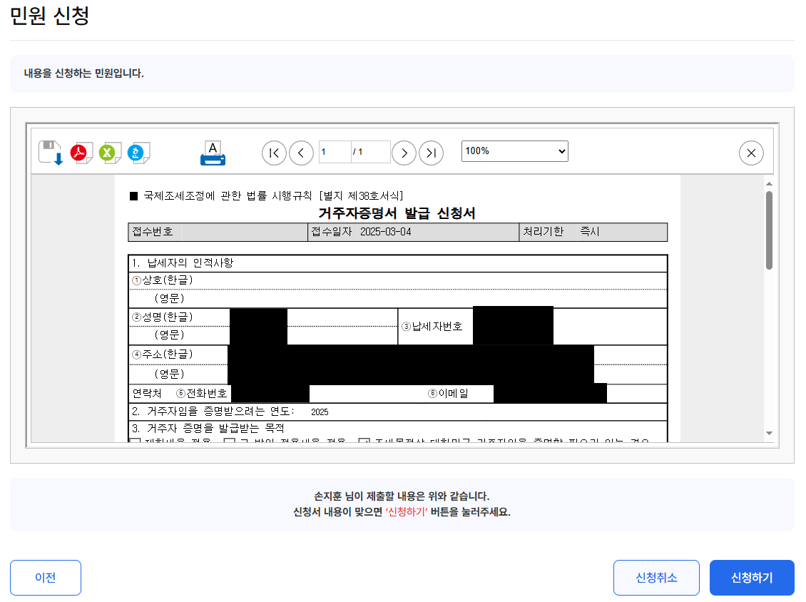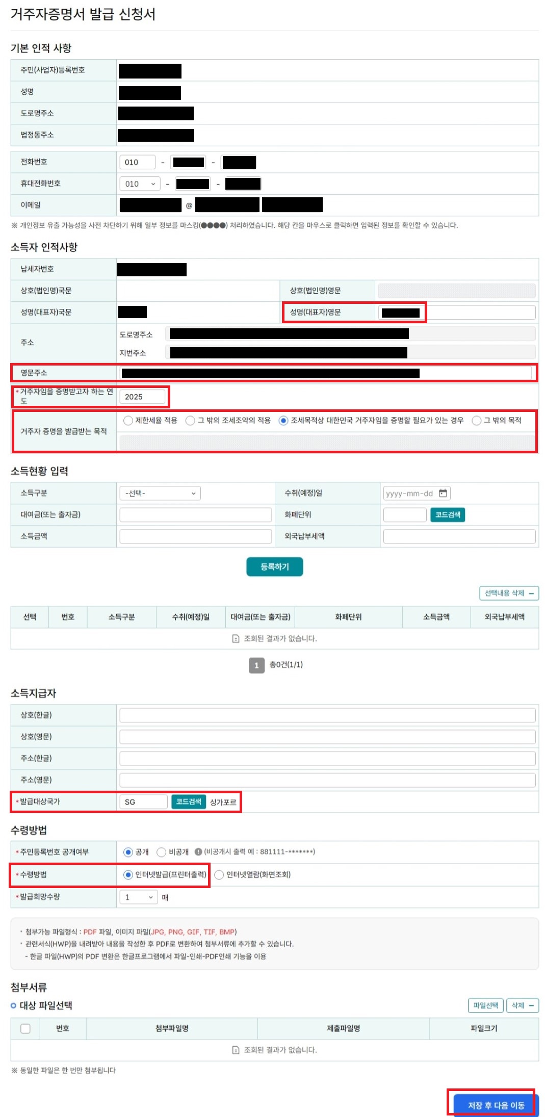 - 거주자임을 증명받고자 하는 연도: 해당 서류를 제출하는 연도를 입력한다.
