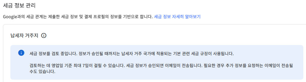 모든 작업이 완료되면 세금 정보를 검토 중이라는 메시지가 뜨며 최장 7일정도가 소요된다.