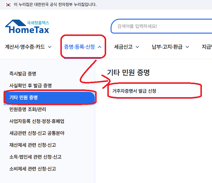 1. 먼저 홈택스에서 '거주자증명서'라는 서류를 발급받아야 한다. 홈택스에 접속해 로그인한 뒤, [증명·등록·신청 > 기타 민원 증명 > 거주자증명서 발급 신청] 을 클릭.