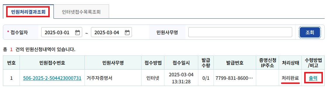 3. 신청이 정상적으로 끝나면 접수목록을 조회할 수 있다. 하지만, 이 서류는 주민등록등본이나 가족관계증명서처럼 즉시발급되는 서류가 아니라 세무서 담당자의 검토 후 발급되는 서류다. 어지간하면 3시간 안에는 발급이 완료되니 '처리완료'로 바뀔 때까지 잠시 기다리자. 이 사이에 홈택스를 끄거나 로그아웃했다면, 다시 로그인한 뒤 첫 화면에서 [등록·증명·신청>민원증명 조회/관리>민원신청 처리결과 조회] 메뉴로 들어가 확인할 수 있다. 처리상태가 '처리완료'로 바뀌면 오른쪽의 '출력'을 클릭한다.