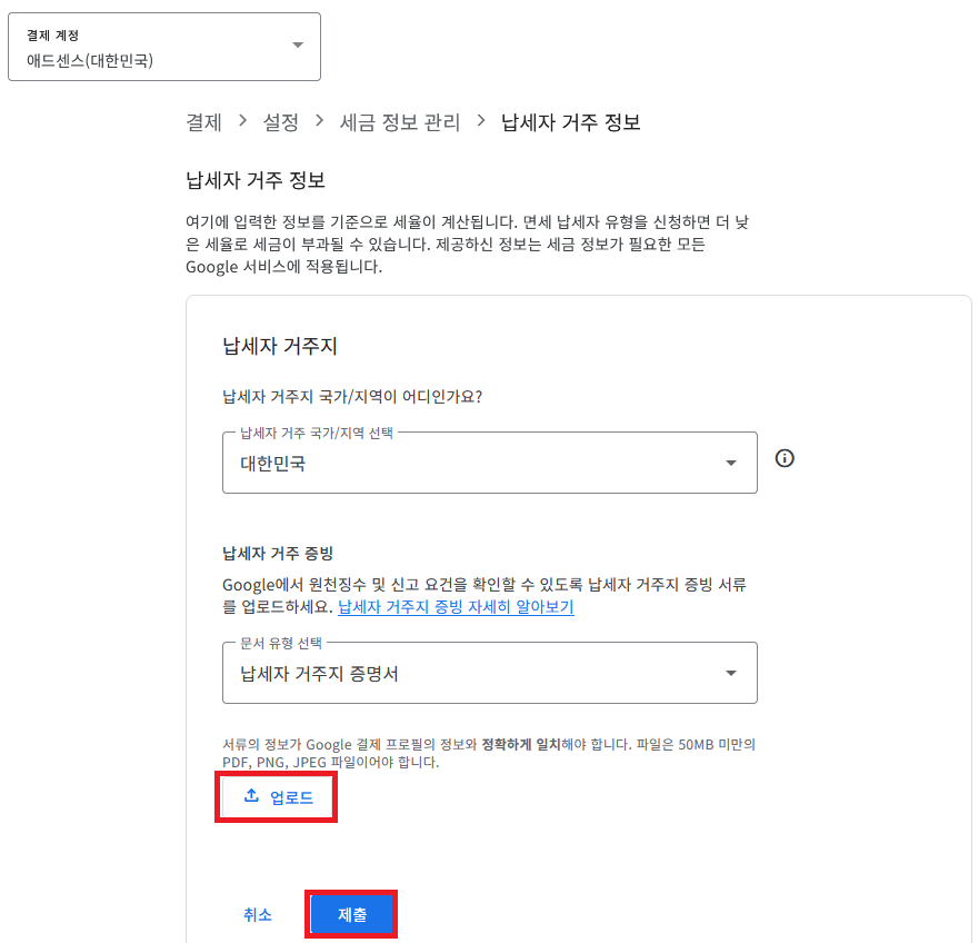 세금 정보 업데이트 화면에서 다른 건 건드릴 필요가 없고 아래쪽 업로드 버튼을 눌러 아까 PDF로 저장해놨던 거주자증명서를 올리자. 파일명은 어떻게 해도 상관없는데 찜찜하면 영문 문서명인 'Certificate of Residence'로 파일명을 바꾸고 업로드하자.