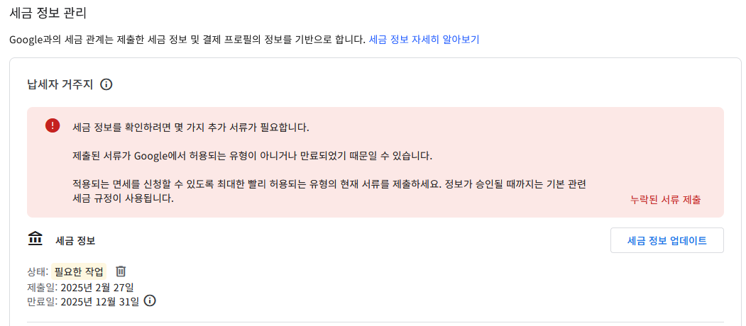 예전에 이걸 한 번 해 둔 것 같은데 매년 이 시간이 찾아온다...애드센스 세금정보 업데이트. 이게 가끔씩 업데이트 하라고 뜨는데 해결하지 않으면 금액이 지급되지 않으니 주의.
