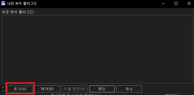 그럼 이와 같이 플러그인 설치목록이 뜨는데(추가가 되어 있지 않으므로 목록이 비어 있다) 추가를 누른 뒤 2번에서 압축을 푼 폴더로 이동하면 slister.wlx64 파일이 있다. 이를 추가하면 설정 완료.