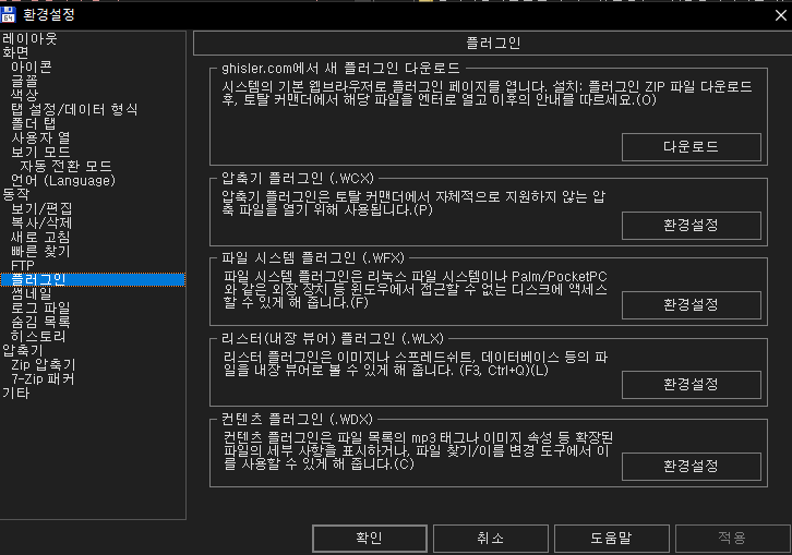 1. 토탈커맨더의 설정을 들어가 '플러그인' 메뉴로 이동하면 '새 플러그인 다운로드' 메뉴가 있다. 여기에서 '다운로드'를 누르면 공식 홈페이지 내 플러그인 사이트로 이동한다.