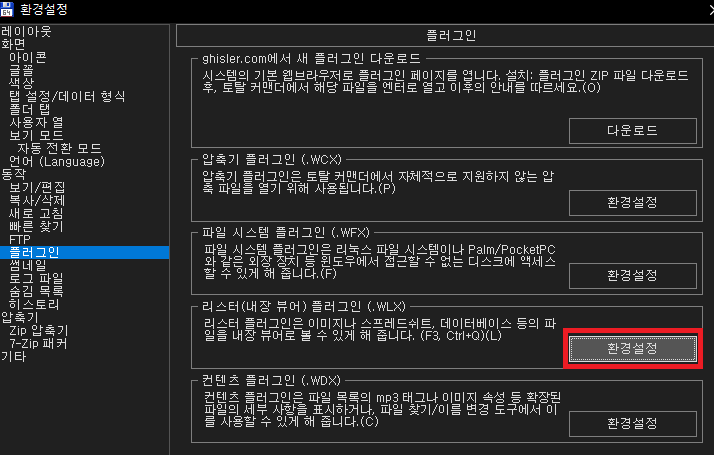 4. 이제 토탈커맨더에 플러그인을 추가할 차례다. 토탈커맨더 설정의 '플러그인' 탭에서 '리스터 플러그인' '환경설정'을 클릭하자.