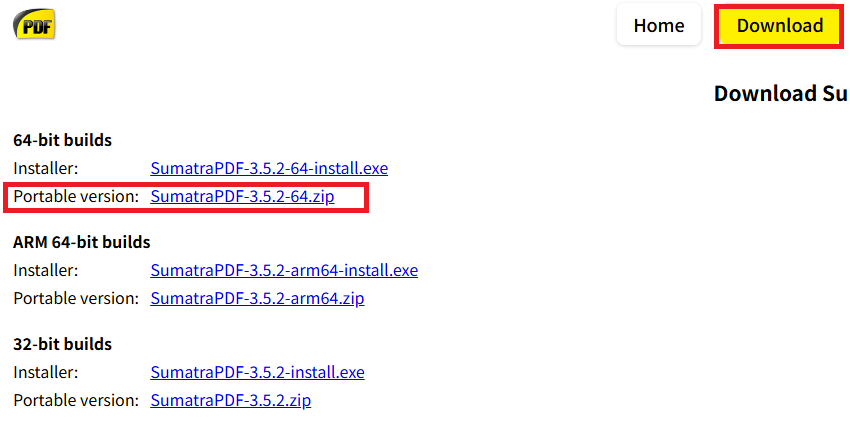 SumatraPDF 공식사이트에 들어간 뒤 Download를 클릭하면 여러 가지 버전의 다운로드가 가능한데 여기서 64비트 포터블 버전을 다운로드받아 압축 해제한다. 해제한 프로그램의 파일명을 SumatraPDF.exe로 바꾼 뒤 앞서 2번에서 압축을 풀었던 폴더에 덮어쓰기하자.