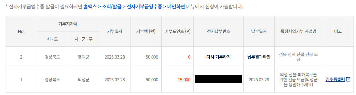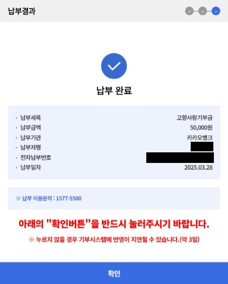 7. 결제가 끝나면 '납부완료' 창이 뜬다. 이 창이 뜨면 돈도 빠져나가 있을 것이고, 기부는 완료된 상태다. 다만 가장 아래쪽의 '확인'을 눌러주지 않고 그냥 종료하면 인터넷지로 납부내역과 기부시스템 연동이 약 3일 정도 지연된다고 한다. 나도 2곳에 기부를 했는데 하나는 '확인'을 누르니까 납부번호와 납부일자가 바로 뜨는 반면, '확인'을 누르지 않고 종료하면 납부결과가 바로 뜨지 않았다. 요 내용이 확인되려면 약 3일이 필요하다고.