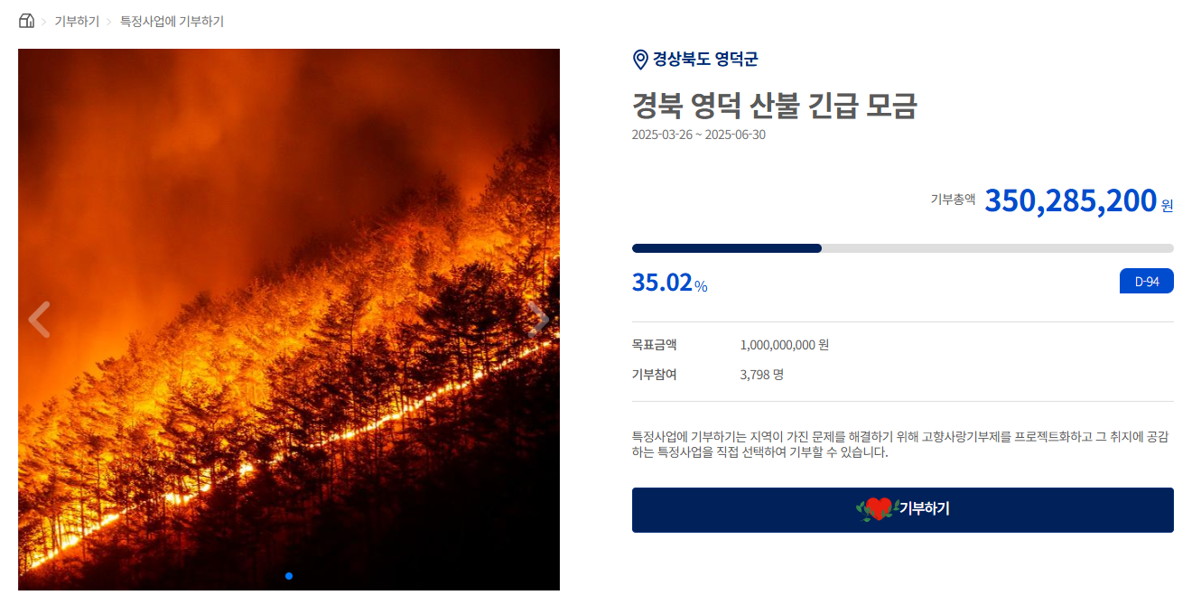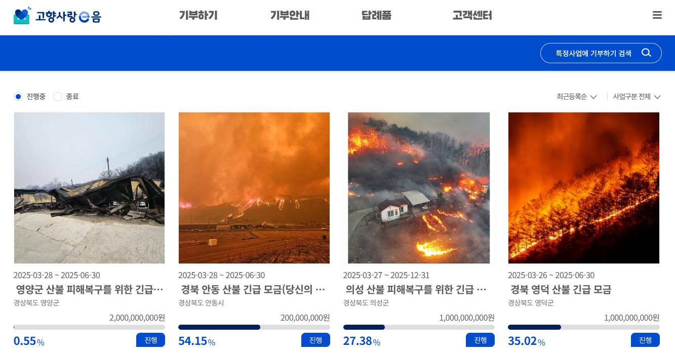 2. 지정기부 목록 중 산불 관련 사업을 클릭. 찾기 힘들다면 검색창에 '산불'로 검색해보자.