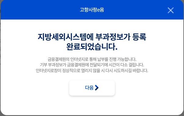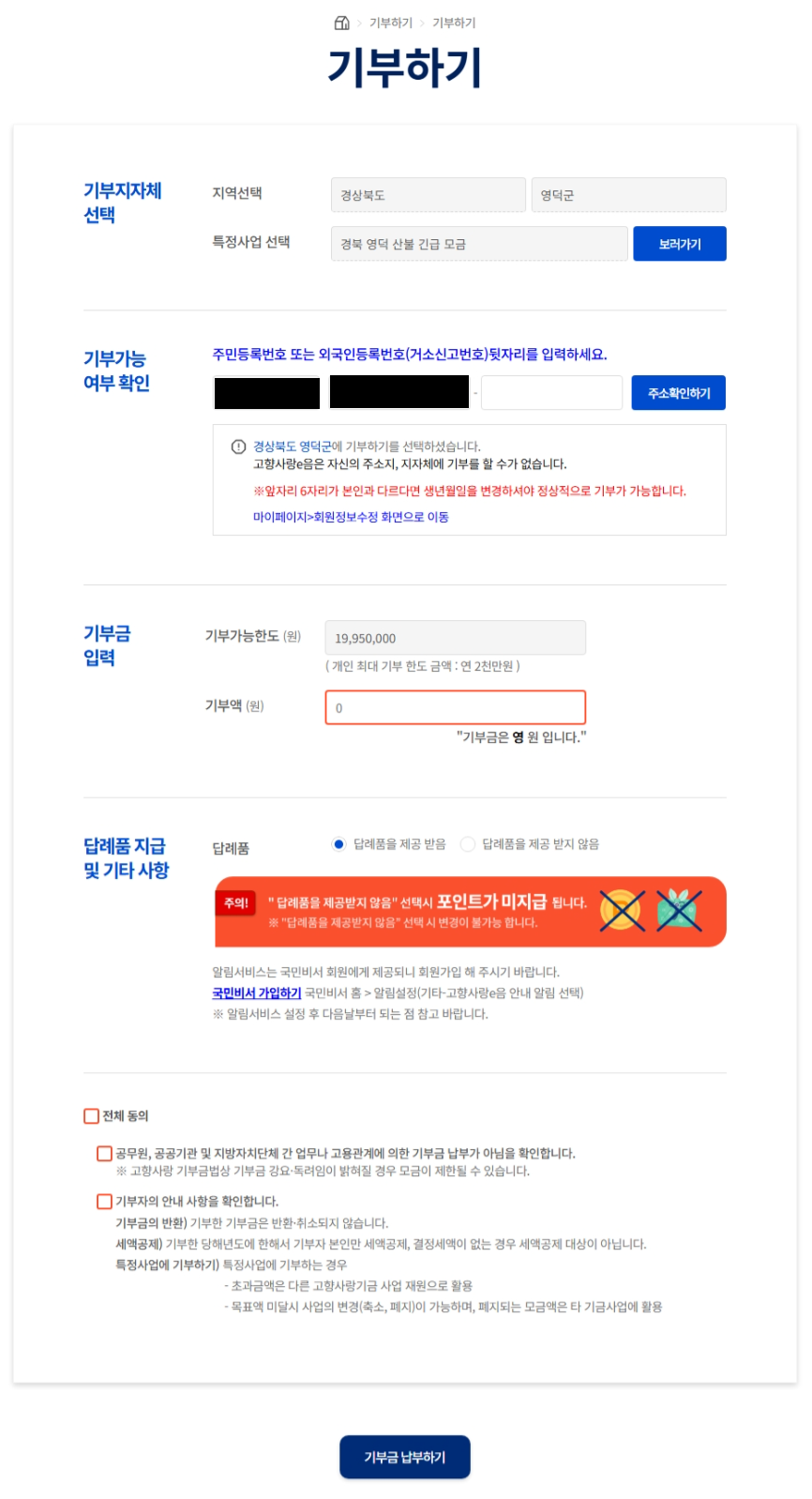 - 답례품지급: 고향사랑기부제로 기부를 하면 기부금의 30%를 포인트로 받아 해당 지자체의 답례품몰에서 사용이 가능한데 이걸 받지 않을 수도 있다. 30% 포인트를 날리겠냐고 물어보는건데 특별한 사정이 없다면 답례품을 제공받는다에 체크하자.