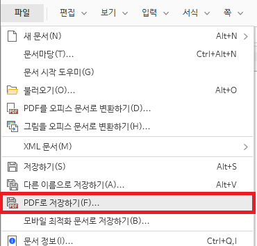 ㄱ. 아래아한글 파일 메뉴 안에 'PDF로 저장하기' 메뉴가 있다. 이를 누르면 hwp(hwpx)를 PDF로 변환할 수 있다.
