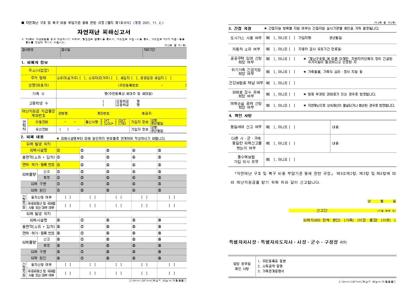 오프라인 신고는 재난지역의 주민등록등본상 주소지 읍면동 행정복지센터(읍면동사무소)에서 접수를 받는다. 만약 전입신고를 하지 않았다면 해당 지역 행정복지센터에 문의할 것. 재난이나 지자체에 따라 그때그때 세부작성사항이 달라지니 미리 가서 확인하는 것이 좋다. 당연하지만 신분증은 필수. 2021 재난피해신고서는 총 3장으로 구성되어 있고 다음과 같이 작성한다.