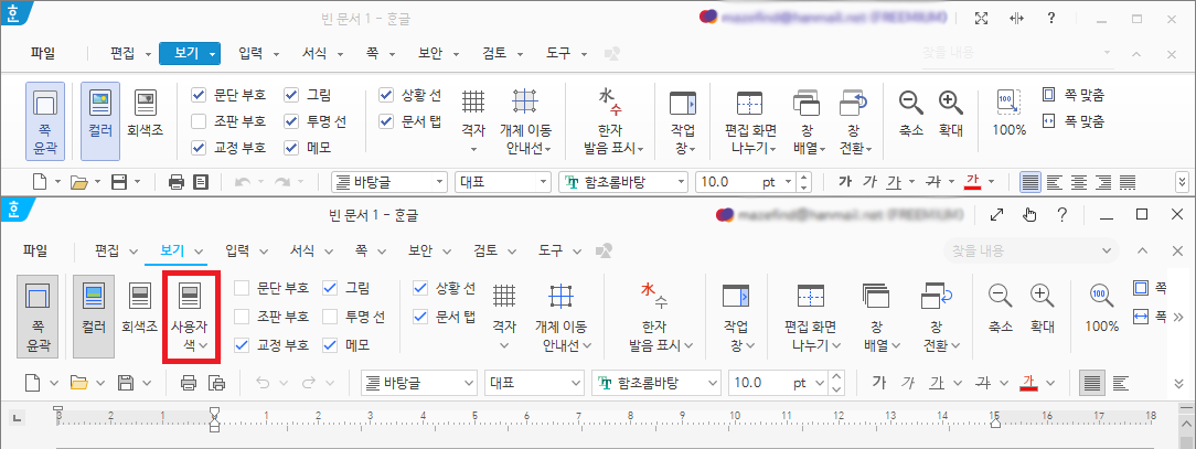 이 '사용자 색' 버튼을 클릭하도록 하자. 또는 [보기 > 컬러/회색조 > 사용자 색] 메뉴를 직접 클릭할 수 있다.