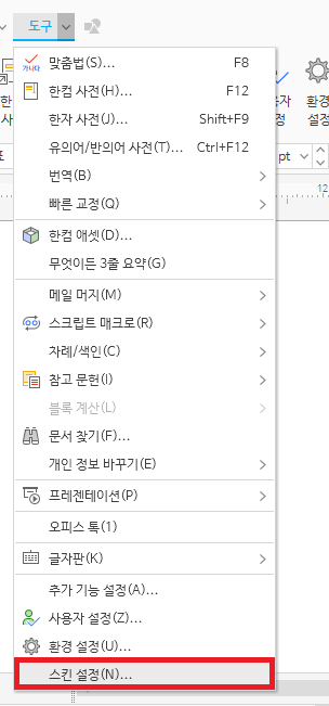 편집창은 검은색이 되었는데 메뉴창은 여전히 밝은색이니 이것도 어두운색으로 만들도록 하자. 상단 메뉴창에서 [도구 > 스킨설정]을 클릭한다.