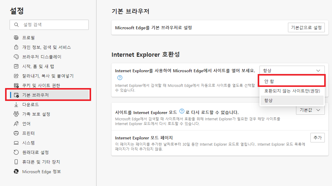 2. 설정에서 '기본 브라우저'를 선택하면 'Internet Explorer를 사용하여 Microsoft Edge에서 사이트를 열어보세요'라는 옵션이 있다. 자동전환을 하겠다고 눌렀다면 '항상'이 선택되어 있는데 이것을 '안함'으로 고쳐주면 된다.