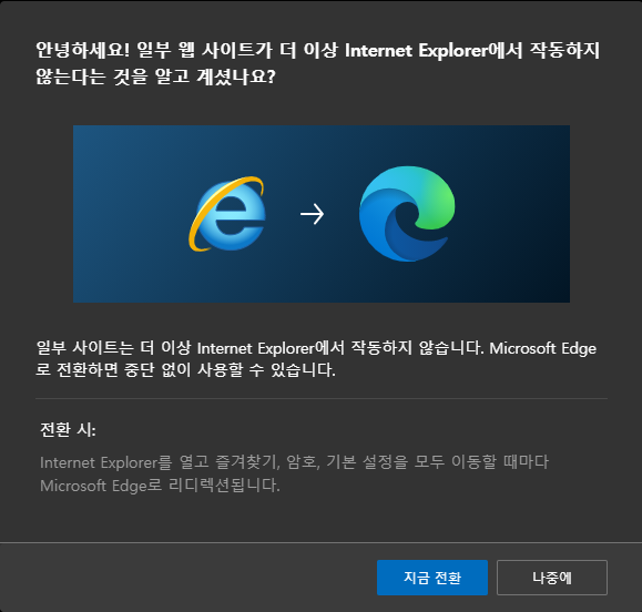 문제는, 이 지원중단을 앞두고 윈도우가 뜬금없이 '지금부터 전환할래?'를 물어본다는 것이다. 게다가 일부러인지 아래쪽의 Y/N 버튼 위치와 색깔 배치가 묘하게 안 맞아서 잘못 누르는 사람이 굉장히 많다. 이걸 전환하면 익스플로러 아이콘을 눌러도 전부 엣지가 켜지면서 사람을 돌아🤬버리게 한다. 단순히 웹서핑만 할 거라면 전환해도 상관없지만 다시 익스플로러를 쓰고 싶다면 다음과 같이 하자.