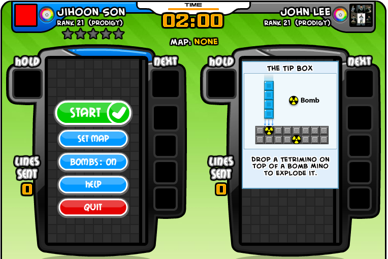 이게 무슨 말인지 모르겠다면 옵션을 켜놓고 몇판 해보신 다음 다시 읽어보시길[...] - OFF : 폭탄 옵션을 끄면 켤 때와는 다른 신세계가 펼쳐집니다; 이떄는 폭탄 블록도 없이 그냥 꽉 채워진 블록이 올라오게 되는데요. 이를 없에려면 2콤보 이상을 하거나 트리플, 테트리스를 성공시켜야 합니다.