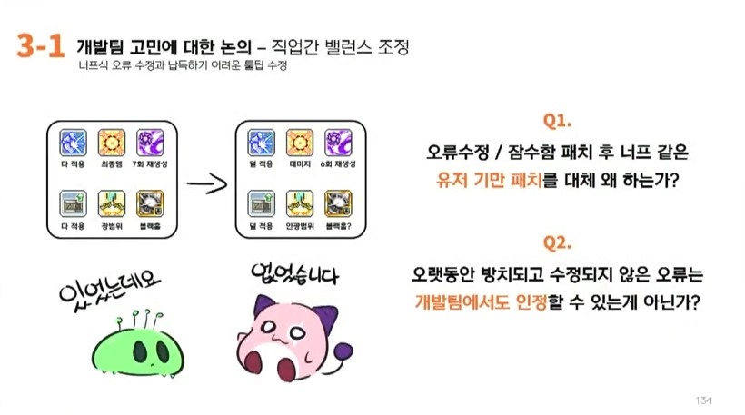 강원기: 그 부분에 대해서도 앞으로에 스킬 밸런스 방향성을 전체 조화를 중시하면서도 개별 캐릭터의 스킬경험들, 밸런스 수준을 너프하지 않고 점차 상향해가는 형태, 그래서 각각의 직업에 플레이경험을 저희가 크게 낮추거나 너프하는 것들이 없이 진행하는 것을 가장 중요한 가치로 생각을 하고 진행하도록 하겠습니다.