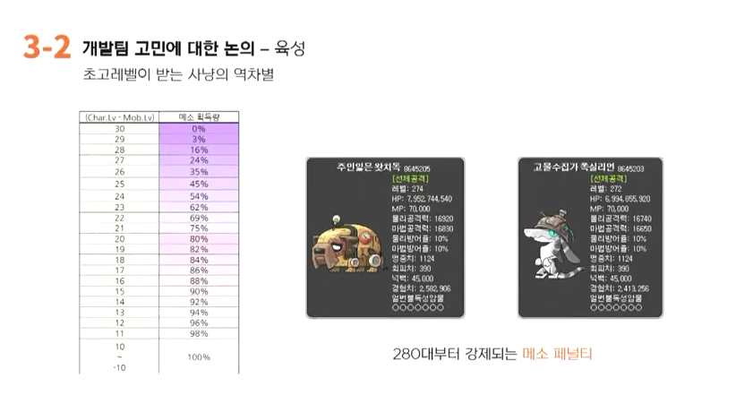 도감은월: 좋은 답변 감사드립니다. 다음 질문으로 넘어가도록 하겠습니다. 다음 주제인 초고레벨이 받는 사냥의 역차별 문제를 먼저 설명드리고 질문을 드리도록 하겠습니다. 현재 메이플에서는 적정레벨 몬스터 사냥을 권장하고 있습니다. 이는 몬스터와 캐릭터별 레벨 차이에 따른 경험치, 메소 비율 변동 시스템을 근거로 들 수 있는데요. 이 시스템에서는 ±1레벨 사이의 몬스터를 잡게 되면 가장 많은 경험치 비율을 획득할 수 있게 설정되어 있습니다. 그러나 4월 시점으로 사냥가능한 곳의 최고 몬스터레벨은 272렙. 직업에 따라 더 낮아지기도 하며 이러한 상황에서 캐릭터 레벨이 280이 넘어가면 오히려 메소 경험치 등을 손해를 보면서 사냥을 할 수밖에 없게 되는데 이러한 상황은 명백한 고레벨에 대한 시스템의 역차별이라고 생각을 합니다. 이에 대한 개발진의 생각을 듣고 싶습니다.