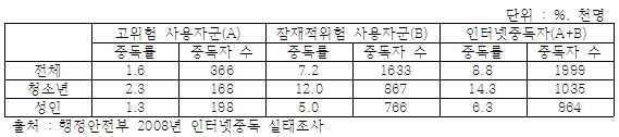 - 현재 우리나라의 만 9~39세 인터넷 이용자 중 중독자는 199만명. 이 중 중증 인터넷 중독인 ‘고위험사용자군’은 전체 중독자의 18%인 36만명임. 연령별로 볼 때 아동·청소년 중독자는 103만명, 중독률 14.3%로 전체 중독자의 50% 이상을 차지.