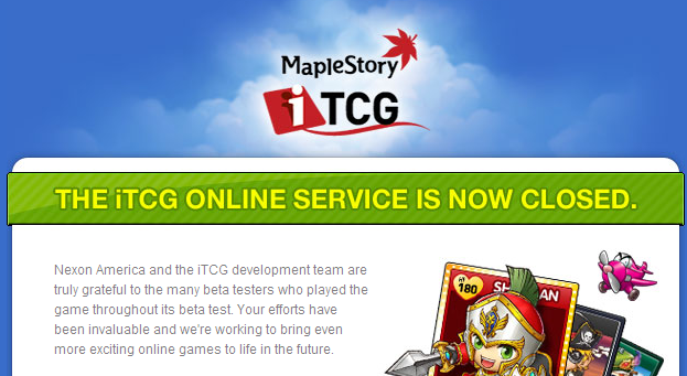 After several months of beta testing, we have decided to close the iTCG Online service effective Thursday, June 10. This was a difficult decision. The closing was based on multiple factors including the ability to deliver new content regularly, and structural changes at Nova Studios, the game's developer. Based on these criteria, we felt that we could not deliver a satisfactory experience, which was the key factor in our decision.